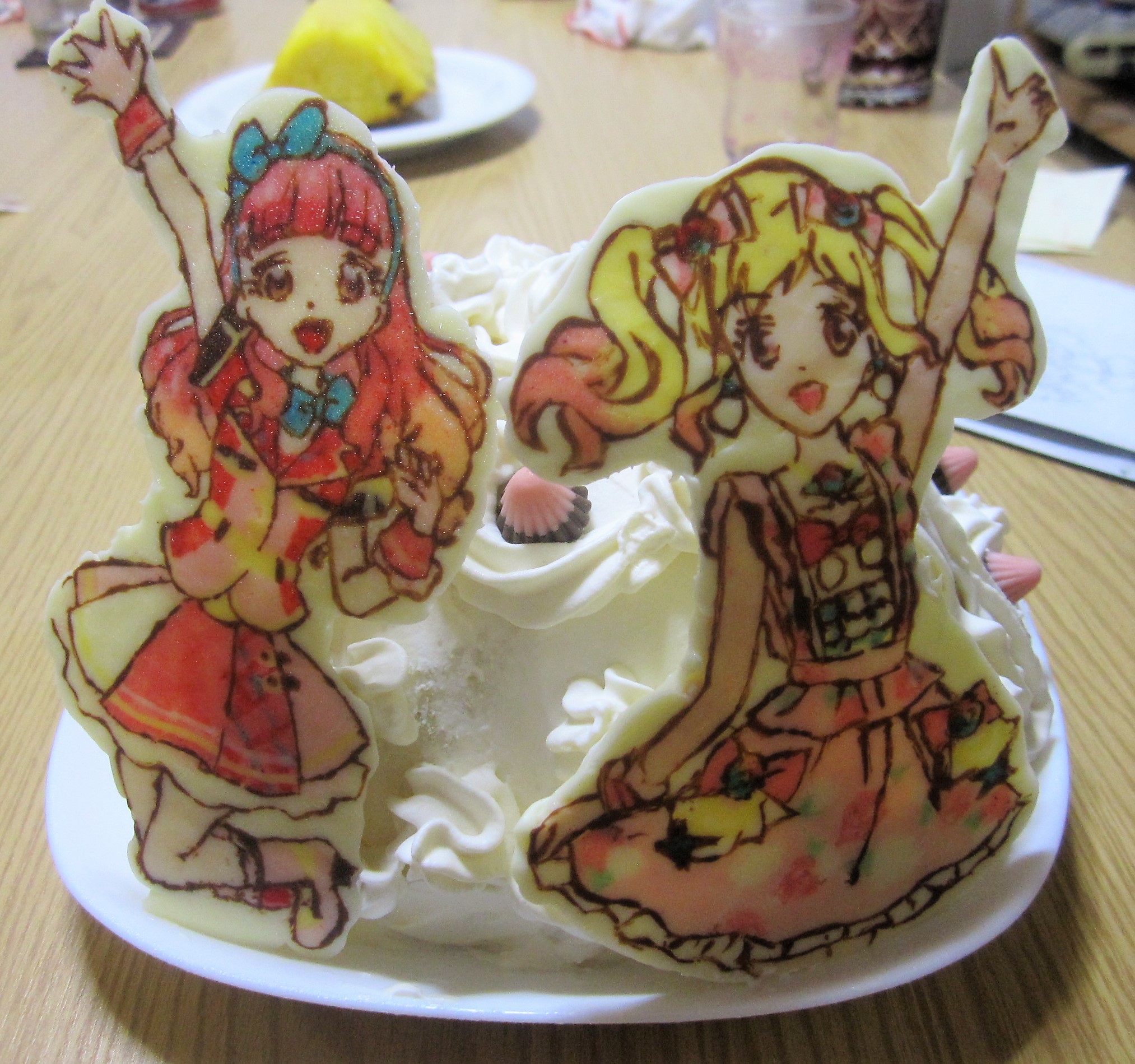 土台はスポンジから焼くと時間がかかるので、市販のスポンジケーキを買い、クリームは子供たちと一緒にデコレーションしました。その上にプリキュアのチョコプレートを置きました。