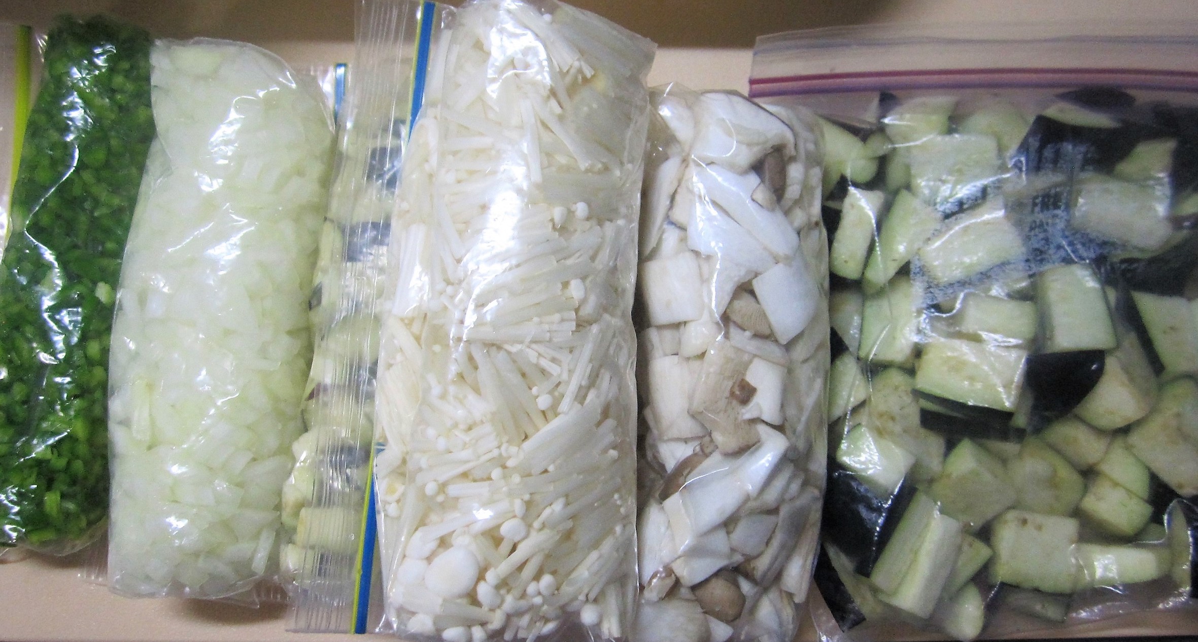 よくある生協などの調理セットを参考に、献立ごとに使う野菜をひとまとめにする方法も試しましたが、ちゃんと献立名を書いておかないと分からなくなるので、ジップロックを何度も使う(ケチくさい…)我が家では書き換えるのが面倒でした。また、下ごしらえまたは料理を夫が手伝ってくれる場合、献立ごとに袋に入れたり、決まった袋を使うのは面倒らしく、続きませんでした。